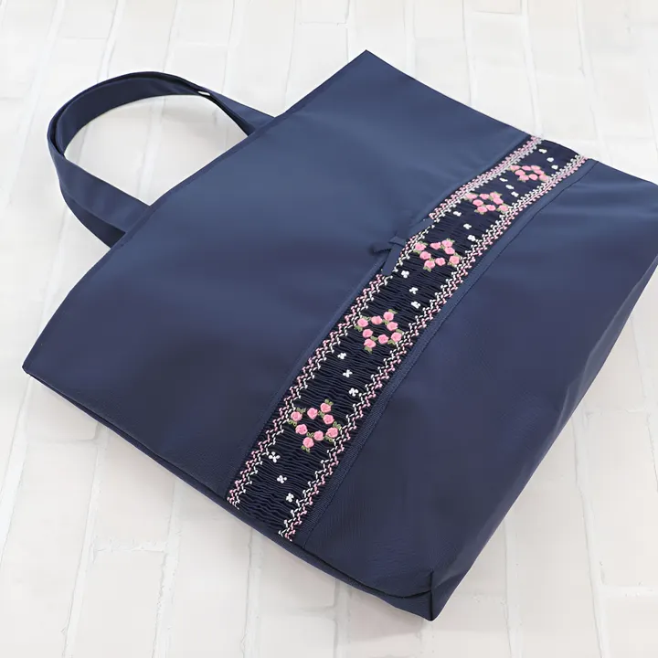 スモッキング刺繍レッスンバッグ 紺 B4サイズ ローズピンク