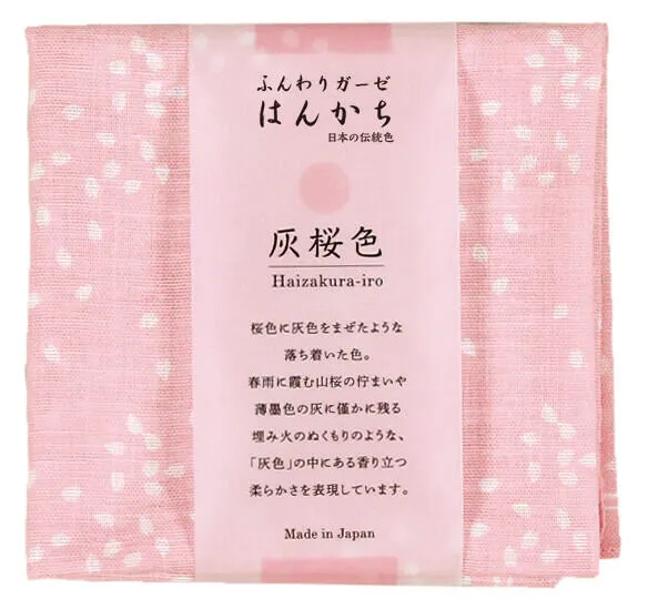 ふんわりガーゼハンカチ 〜日本の伝統色〜 日本では古来より、暮らしの中に多彩な色合いを取り入れ、繊細な色の世界を見出し、その豊かな情趣を愛でてきました。日本人の美の心が生み出した、色と文様をぜひお楽しみください。 ふんわりとした肌触りと吸収性の良いガーゼ素材を使用。 灰桜色:桜花びら文様桜色に灰色をまぜたような落ち着いた色。春雨に霞む山桜の佇まいや薄墨色の灰に残る埋み火のぬくもりのような、「灰色」の中にある香り立つ柔らかさを表現しています。