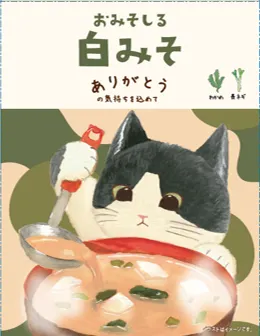 愛らしいネコがお椀に注ぐイラストが特徴1P商品です。 「ありがとう気持ちを込めて」メッセージ付き、日頃の感謝の気持ちや贈り物やノベルティーなどに向いております。 味は特徴は、鰹節、さば節を絶妙に配合した、風味豊かな粉末を使用した即席みそ汁です。 具材はわかめ、ネギを使用し、シンプルながらバランスよく仕上げました。