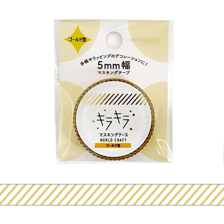 【キラキラマスキングテープ5mm Stripe 】 ◎ ベーシックで使いやすい定番柄のストライプ柄デザイン。  使用例画像のように、ラインマーカーの上に貼るとおしゃれさがUP! ◎主張しすぎない絶妙なストライプの細さと箔がポイント♪ ◎手帳やレター、ちょっと特別なメモなど貼るだけで素敵な手紙に仕上がります。 ---------------------------------------------------------------------------------------  ◇◇ キラキラマスキングテープ 5mm ◇◇ 大人気シリーズ!箔を使用した、キラキラした輝きがかわいい キラキラマスキングテープに5mm幅が新登場! Simple、Decoration の2つをテーマに <15柄> 揃えました。 <15柄一覧> ●Simple  KRMT5-001 / Line  KRMT5-002 / Polka dot  KRMT5-003 / Stripe  KRMT5-004 / Checkered  KRMT5-005 / Star  KRMT5-006 / Sparkly  KRMT5-007 / Heart  KRMT5-008 / Curl  KRMT5-009 / Scalloped  KRMT5-010 / Semicircle ●Decoration  KRMT5-011 / Dot  KRMT5-012 / Music  KRMT5-013 / Garland  KRMT5-014 / Leaf  KRMT5-015 / Flower