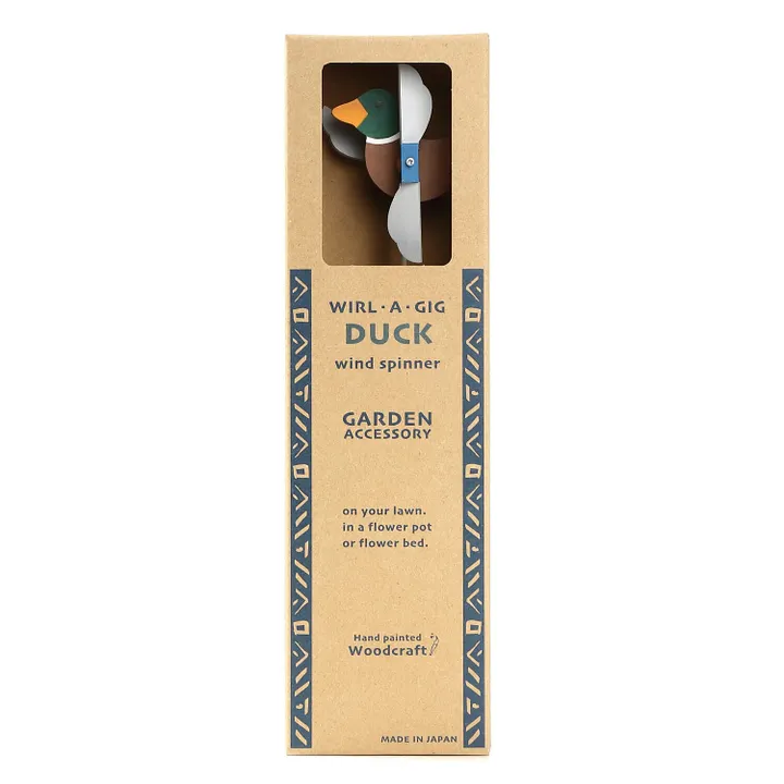 風を受けて羽がクルクル回るハンドメイドのガーデンアクセサリー。 カモ、カラス、アヒルの3種のラインナップです。 植木鉢に挿したり、風通しの良い場所に置いたりして、たまにメンテナンスをしながらお楽しみください。 庭を見たり、庭に出たりするキッカケを、庭での時間に新たな楽しみをもたらしてくれるアイテムです。 ペイントは作業者の安全性も考慮し、環境にやさしい水性塗料を使用。 1体ずつ手作業で絵付けをしており、よく見るとそれぞれ異なった表情をしています。 日々の暮らしに潤いと癒しを与えてくれる、手仕事ならではのあたたかさと愛嬌。 現代の民芸として、素朴な魅力を感じていただけたら幸いです。 ONE POINT 本体のパーツは無垢材のヒノキを使用しています。 水に強く、抗菌作用にも優れたヒノキの無垢材を使用する事で、水を含んで剥がれたり割れたりする事を防いでいます。
