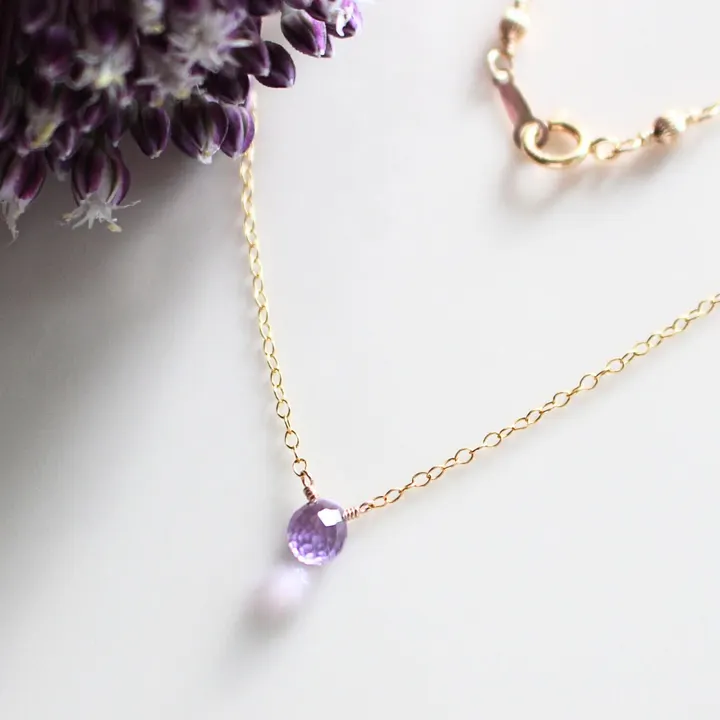 美しいカッティングのアメジストを使ったネックレスは、 身に着ける方を美しく魅せるようなアイテムです。 アメジスト独特の藤色のような優しい紫は、 まるで身につける方の優しさを引き出すような魅力があります。 さりげない大きさのため、 装いを選ばすどんなシーンにも対応できるような、 万能ネックレスです。 アメジスト 2月の誕生石 KEYWORDs:守護/平穏/癒し/恋愛/魅力 ◆次回の入荷は未定です。現在のところ在庫限りの商品となります。 ~天然石のネックレスとピアス~ 自然が長い年月を経て創り出した美しい天然石の魅力を、 最大限に感じられるようなネックレスとピアス。 ご自分がピンとくるお気に入りの天然石が、 まるでお守りのようにも感じられるかもしれません。 日々の中で、身につけるたびに小さな幸せを感じられる。 そんなアイテムを揃えています。 ~素材へのこだわり~ RIVA GOSSIで扱っているアクセサリーの中で 基本的に、直接肌に触れるパーツ金属部分は ゴールド色は、14KGF(14Kゴールドフィルド) シルバー色は、SV925(銀92.5%/スターリングシルバー) これらの素材で制作しています。 直接肌に触れない部分に関してはメッキ素材を使用することもあります。 ページ内の原材料表示部分をご確認ください。 14KGF(14Kゴールドフィルド)とは、 かなり厚い層で14Kコーティングした素材で、 金属アレルギーを起こしにくいといわれています。 ※全ての方にアレルギーが起こらないわけではありません。 ほとんどはがれることはなく、 欧米などではポピュラーな素材です。 金メッキ素材よりも値がはりますが、 18Kなどよりお求めやすく、 天然石のアクセサリーを、 より身近に楽しむことができます。 お客様に安心してアクセサリーを選んでいただけるように 素材にもこだわっています。