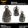 アメリカ製ガーディアンベル社製ガーディアンベルです。 MADE IN USA アメリカ製 交通安全 魔除け 御守り ガーディアンベル アメリカのライダーの間には、事故や、転倒の原因は「道路にひそむ悪魔」によるいたずらだという伝説があります。悪魔は走る者に悪戯やトラブルを運んできます。このベルは美しい音色で悪魔たちを追い払うと言われ愛されています。そんな悪魔のいたずらを防ぎ、御守りとなるのが、守護者のベルという意味を持つガーディアンベル。 日本でも鈴の音(ね)は神道では魔除けの音と言われています。ピューター製の鈴でいい音色でガーディアンベルはデザインも様々あります。 またガーディアンベルにまつわる伝説として、プレゼントとして送られたベルの効果は、自分で手に入れたものの2倍になると言われています。 それゆえに彼氏・彼女・友達・家族へのプレゼントとしての人気も非常に高まっています。 シルバーアクセサリーのようにおしゃれに装着できて素敵な音色を奏でるガーディアンベル。 バイカー以外にも自転車や旅・交通安全のお守りとしてお使いいただけます。 カバン・ランドセル・キーホルダー・ペットの首輪等に付けてお使いください!! ※タイラップ等でバイクのフレームにも簡単に取り付けできます。 アメリカンモデルだけではなく、旧車ファン、レプリカライダーまで、さらにバイクだけでなく、自転車や車にもピッタリな御守りとなっています。 アクセサリーとしても人気で、アイディア次第で車体だけでなく、キーホルダーや鞄など、どこにでも付けておしゃれに楽しめます。