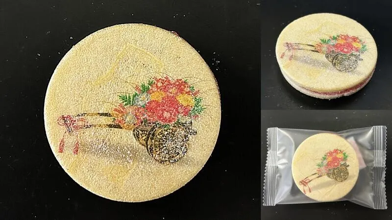 もなか種(だね)に羊羹をサンドした半生菓子。花の和文様に使用される「花車」を食用色素でプリントしました。羊羹は、梅ジャム(南高梅)を練り込んだ梅羊羹です。