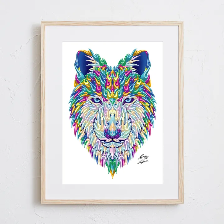 【現代アートポスター】動物 オオカミ 狼 模様 イラスト A4(S) フレームセット:無垢 30.4×39.4cm