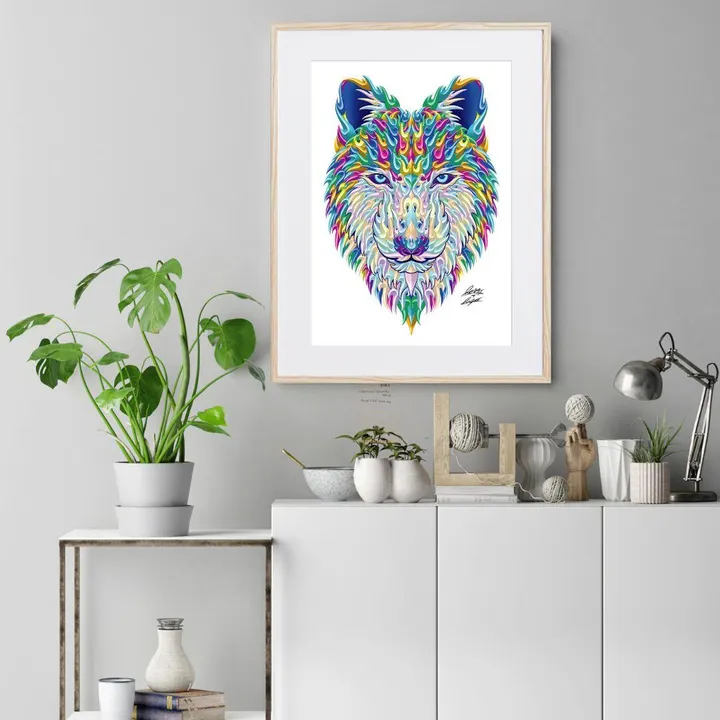 アーティスト -PROFILE- Madblast Hiro(ヒロ) 岐阜県出身。ライブペインター / アーティスト 2021年には大阪府の貝掛中学校の皆様と長さ230mの壁画を制作。 岐阜駅前の繊維問屋街では高さ16mの壁画を制作の他、G-SHOCKやSONY、BETONES等に作品提供を行う。 独自の模様をブロックのように積み上げる表現を突き詰める。 【作品について】 カラフルな色使いはMadblast Hiroの得意とする表現方法の一つ。 躍動的な雰囲気で、見る人を引き込む圧倒的な存在感を感じるアート。 作品名:Mad Wolf 手法:イラスト、デジタル ペーパー:高品質半光沢紙 マットカラー:白 マット*:DXホワイト芯 100%バージンパルプ/PH7・中性紙(2mm厚) ※全てのアートにマットがつきます フレームカラー:黒、白、無垢(3種類から選択) ※マット付のため通常とはフレームサイズが異なる規格となります。 【マット*とは?】 アートポスターの周りに挟んだ厚紙の事。 マットを使わない時に比べ余白により広がりが生まれ、作品の新たな一面を引き出せ作品の見栄えがグッと良くなります。また、額縁のガラス面と作品が直接触れたままにしておくと、くっついて作品を傷つけることがあります。マットを使用することでガラスと作品の間に空間ができ、作品を保護することができます。ブランドコンセプトにより全てのアートにマットがつきます。 ー ファッションのようにアートを ー 私達が掲げるコンセプトです! 毎日着替えるファッションの様に、アートも気軽に飾り変えて欲しい... 一旦飾り終えたアートにも光を当ててほしい... ポスター単体、またはリピートで中身だけのポスターを購入された方に"専用のハンガー"をセットでお届け。 「今までに無い!新しいアートの飾り方を提案」 飾る事がなくなった前のアートをハンガーにかけて洋服と一緒にかけてもらう。 その日の気分や、モチベーションですぐに取り換えられる様に。 もちろん、魅せる収納としても今までにないおすすめの飾り方です。