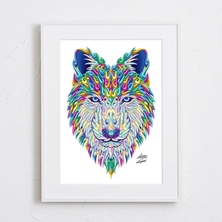 アーティスト -PROFILE- Madblast Hiro(ヒロ) 岐阜県出身。ライブペインター / アーティスト 2021年には大阪府の貝掛中学校の皆様と長さ230mの壁画を制作。 岐阜駅前の繊維問屋街では高さ16mの壁画を制作の他、G-SHOCKやSONY、BETONES等に作品提供を行う。 独自の模様をブロックのように積み上げる表現を突き詰める。 【作品について】 カラフルな色使いはMadblast Hiroの得意とする表現方法の一つ。 躍動的な雰囲気で、見る人を引き込む圧倒的な存在感を感じるアート。 作品名:Mad Wolf 手法:イラスト、デジタル ペーパー:高品質半光沢紙 マットカラー:白 マット*:DXホワイト芯 100%バージンパルプ/PH7・中性紙(2mm厚) ※全てのアートにマットがつきます フレームカラー:黒、白、無垢(3種類から選択) ※マット付のため通常とはフレームサイズが異なる規格となります。 【マット*とは?】 アートポスターの周りに挟んだ厚紙の事。 マットを使わない時に比べ余白により広がりが生まれ、作品の新たな一面を引き出せ作品の見栄えがグッと良くなります。また、額縁のガラス面と作品が直接触れたままにしておくと、くっついて作品を傷つけることがあります。マットを使用することでガラスと作品の間に空間ができ、作品を保護することができます。ブランドコンセプトにより全てのアートにマットがつきます。 ー ファッションのようにアートを ー 私達が掲げるコンセプトです! 毎日着替えるファッションの様に、アートも気軽に飾り変えて欲しい... 一旦飾り終えたアートにも光を当ててほしい... ポスター単体、またはリピートで中身だけのポスターを購入された方に"専用のハンガー"をセットでお届け。 「今までに無い!新しいアートの飾り方を提案」 飾る事がなくなった前のアートをハンガーにかけて洋服と一緒にかけてもらう。 その日の気分や、モチベーションですぐに取り換えられる様に。 もちろん、魅せる収納としても今までにないおすすめの飾り方です。