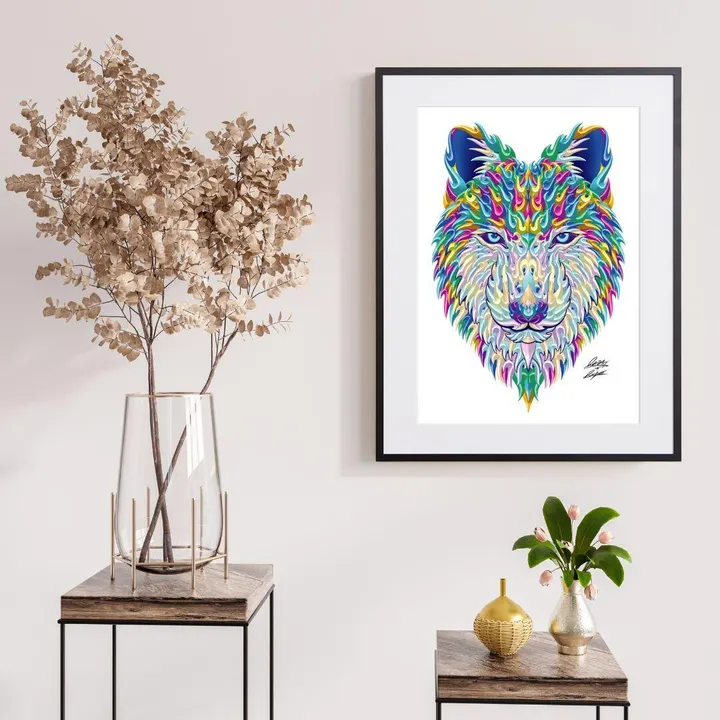 アーティスト -PROFILE- Madblast Hiro(ヒロ) 岐阜県出身。ライブペインター / アーティスト 2021年には大阪府の貝掛中学校の皆様と長さ230mの壁画を制作。 岐阜駅前の繊維問屋街では高さ16mの壁画を制作の他、G-SHOCKやSONY、BETONES等に作品提供を行う。 独自の模様をブロックのように積み上げる表現を突き詰める。 【作品について】 カラフルな色使いはMadblast Hiroの得意とする表現方法の一つ。 躍動的な雰囲気で、見る人を引き込む圧倒的な存在感を感じるアート。 作品名:Mad Wolf 手法:イラスト、デジタル ペーパー:高品質半光沢紙 マットカラー:白 マット*:DXホワイト芯 100%バージンパルプ/PH7・中性紙(2mm厚) ※全てのアートにマットがつきます フレームカラー:黒、白、無垢(3種類から選択) ※マット付のため通常とはフレームサイズが異なる規格となります。 【マット*とは?】 アートポスターの周りに挟んだ厚紙の事。 マットを使わない時に比べ余白により広がりが生まれ、作品の新たな一面を引き出せ作品の見栄えがグッと良くなります。また、額縁のガラス面と作品が直接触れたままにしておくと、くっついて作品を傷つけることがあります。マットを使用することでガラスと作品の間に空間ができ、作品を保護することができます。ブランドコンセプトにより全てのアートにマットがつきます。 ー ファッションのようにアートを ー 私達が掲げるコンセプトです! 毎日着替えるファッションの様に、アートも気軽に飾り変えて欲しい... 一旦飾り終えたアートにも光を当ててほしい... ポスター単体、またはリピートで中身だけのポスターを購入された方に"専用のハンガー"をセットでお届け。 「今までに無い!新しいアートの飾り方を提案」 飾る事がなくなった前のアートをハンガーにかけて洋服と一緒にかけてもらう。 その日の気分や、モチベーションですぐに取り換えられる様に。 もちろん、魅せる収納としても今までにないおすすめの飾り方です。