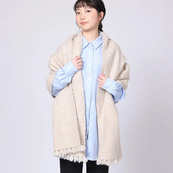 ふんわりと柔らかい風合いに仕上げたショールは、肩周りをすっぽり包んでくれる大判サイズ。少し肌寒く感じる季節から、アウター代わりとして活躍してくれます。外出時はもちろん、お部屋でくつろぐ時のブランケット代わりにもオススメ。裾に並んだ小さなフリンジが季節感をプラスしてくれます。 アンゴラヤギの毛から作られるモヘヤは、毛足が長く、やわらかい肌ざわりと絹のような光沢が特徴です。保温力と吸湿性に優れているため、冬物のニット製品によく使用されます。こちらの製品は合成繊維との混合糸を使用していますので、品質表示をご確認の上お手入れしてください。起毛加工は、織物や編物の表面を針や突起物でかき出して毛羽立たせる加工です。起毛することで、素材の厚みが増し、風合が柔らかくなるほか、保温性を高める効果もあります。