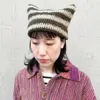 太糸でボリューム感のある猫耳ニット。かぶると耳が自立する仕様。伸ばして深くかぶっても、折り曲げて浅くもかぶれます。4,5 番色はボーダーデザインです。
