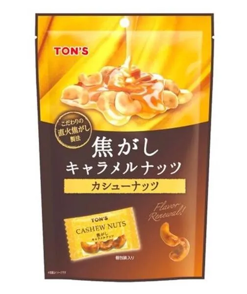 小さなひと粒、笑顔のひととき。 丁寧に焙煎したカシューナッツを、直火焦がし製法でキャラメルコートしました。 際立つ香ばしさと上品な甘さ、隠し味はひとつまみの塩。 コク深いバターの風味が加わり、さらにおいしくなりました。