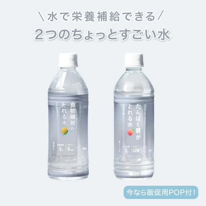 \今なら販促物がついてくる/ 水で栄養がとれる、新習慣ウォーター たんぱく質がとれる水と食物繊維がとれる水、それぞれ1ケース24本、計48本のセットです。 ※ 希望小売価格 たんぱく質がとれる¥178+税・食物繊維がとれる水¥148+税 ▼たんぱく質がとれる水Points 1.水分補給しながらたんぱく質がとれる   “美容たんぱく質”ともいわれる、低分子コラーゲンを採用。    ふだんの水分補給で、たんぱく質5gがとれます。 2.甘すぎず飲みやすい、ほんのり若桃の味わい   ホテルのリフレッシュメントウォーターをイメージした、爽やかな飲み心地。    低カロリーでごくごく飲めます。       3. 海洋深層水由来ミネラル*3使用   高知県室戸沖の海洋深層水由来のミネラル使用。    外出先やスポーツ時の水分補給におすすめです。 *1  20kcal /100ml以下を低カロリーと表記しています *2  本商品におけるミネラルとはナトリウムのことです ▼食物繊維がとれる水Points 1.水分補給で、レタス約1.5個分*の高品質な食物繊維がとれる   医療現場で選ばれてきた食物繊維「グアー豆食物繊維」を採用。    高発酵性なので善玉菌の栄養になりやすく、発酵速度が穏やかなのでおなかにもやさしい。 2.甘くなく飲みやすい、すっきりとしたレモンの味わい。    ホテルのリフレッシュメントウォーターをイメージした、爽やかな飲み心地。     ごくごく飲める0kcal**です。       3. 海洋深層水由来ミネラル***使用。   高知県室戸沖の海洋深層水由来のミネラル使用。    外出先やスポーツ時の水分補給におすすめです。  *文部科学省「日本食品標準成分表(八訂)増補2023年」 **5kcal/100ml未満を0kcalと表記しています ***本商品におけるミネラルとはナトリウムのことです