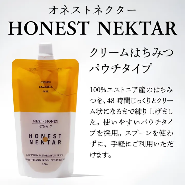 100%エストニア産のはちみつをじっくりとクリーム状に練り込みました。便利なパウチタイプ! 北欧の豊かな自然と透き通った空気のもとうまれた栄養たっぷりのこだわりはちみつ。 【内容量】 200g 【原材料】 はちみつ 【賞味期限】 製造より36か月 【JANコード】 4518568021529