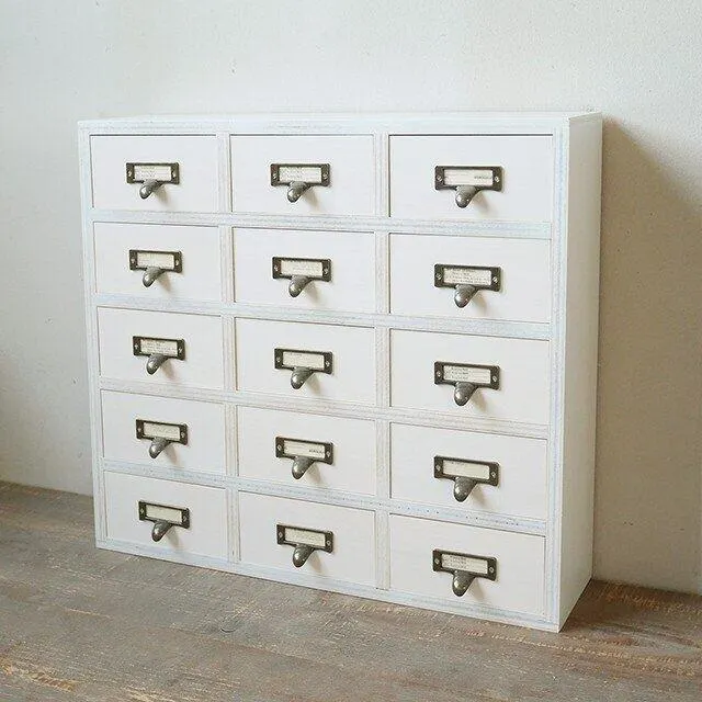 北海道 旭川市の自社工場で製作しています 大人気のミニチェスト。 アンティーク風の金具がアクセント。 ちょっとした小物の収納にピッタリ。 引き出しが15個もあり、取っ手金具にラベル入れがついているので細かいパーツなどの分類にも便利。 文具や手芸用品など、お道具箱として使い勝手が良い。 ■商品サイズ 外寸 約 横幅450×奥行110×高さ412mm 引き出し内寸 約 横幅112×奥行82×深さ55mm  (板の厚みなどで、多少の誤差が出る場合があります) ■材質 合板を使用。 木目、色合いなどが1つ1つ違います。