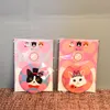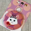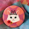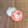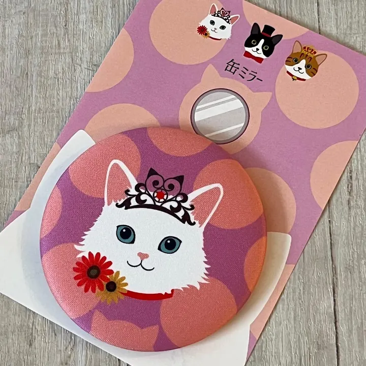 持ち運び便利なコンパクトミラーです。缶バッジの裏面が鏡になっていて、化粧ポーチなどに入れて持ち歩けます。ファブリックに猫の柄がプリントされています。