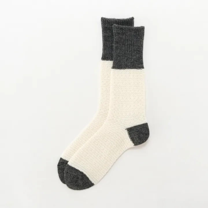 英国羊毛のブレンドヤーン。 英国羊毛はその名の通り英国で育った羊だが、品種の多さは世界一。 北極圏からの寒気、雨風の続く山岳地帯の厳しい環境で育つことによって、独特なハリとコシ、かさ高性(繊維のふくらみ)が特徴です。リブ、ケーブル、シードステッチ(鹿の子)でバリエーションを出しました。 92%WOOL.6%POLYESTER,2%POLYURETHANE 日本製