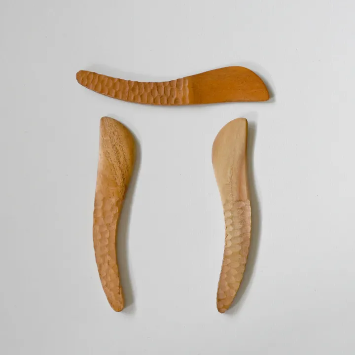 試行錯誤してサンプリングを重ねたニームウッドのバターナイフ。 軽く、彫りが手にフィットして持ち心地が良く、使い心地抜群です。 ベンガル地方では馴染み深いマスタードオイルで仕上げています。 インドのコルカタから車で3時間の山奥にニームカトラリ―の生産者の村があります。 「ミラクルニーム」とも呼ばれるとても薬効の高い木で作ってもらった食器は、 ナチュラルな風合いで食卓に温かみをそえてくれます。 フェアトレードNGO・サシャと提携したフェアトレード商品です。