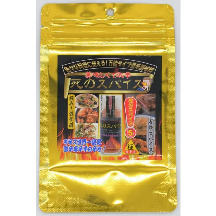 ★テレビ番組(有吉ゼミなど)や、YOUTUBEなどの激辛企画で、しばしば紹介されている超激辛スパイスです! ★ギネス世界一認定の激辛とうがらしを使用!(キャロライナ・リーパー、ブートジョロキア) ★美味しくて激辛「ただ辛いだけではありません」15種類以上のスパイスをバランスよく配合 ★肉料理や揚げ物、スナック菓子などが手軽にプロの味。冷凍食品にもそのままかけるだけで簡単グレードアップ! ★辛い食べ物がお好きな方は是非一度お試し頂きたいスパイスです! 【使用方法】 美味しくて激辛なスパイス調味料です。から揚げ、ステーキ、焼き肉、チキンステーキ、やき鳥、生姜焼きなどの肉料理やパスタ、ポテトフライ、ピラフ、フライドチキン等にそのままかけてお使いください。BBQにも最適です。ポテトチップス、ポップコーン等のスナック菓子にそのままかけても大変美味しいです。 【原材料・成分】 塩(岩塩)、唐辛子(キャロライナ・リーパー、ブートジョロキア)、にんにく、胡椒、クミン、コリアンダー、オレガノ、セージ、アミノ酸、他 【保存方法】 直射日光、高温多湿を避けて保存してください。
