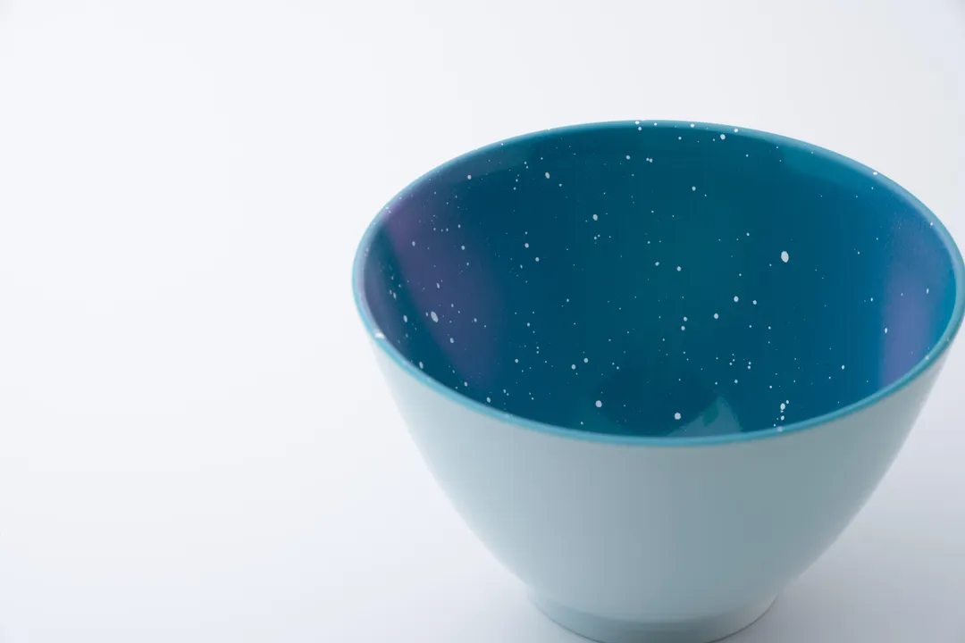 石川県加賀市の冬の景色をモチーフにした蓋付の大きめのお椀。外側は雪景色の白青のグラデーション、内側は川を表す青に日光が差し込んだような紫や緑を加えた変わり塗りです。内外の対照的な色彩で「侘び寂び」を感じることができます。お椀としてみそ汁はもちろん、麺類、お雑煮、アイスクリームも入れるデザートしても良いです。食洗器、電子レンジ対応のプラスチック素地に職人が一つ一つ吹付塗装で塗り重ねられた独特のフォルムで食卓に鮮やかな色彩を放つプロダクトです。
