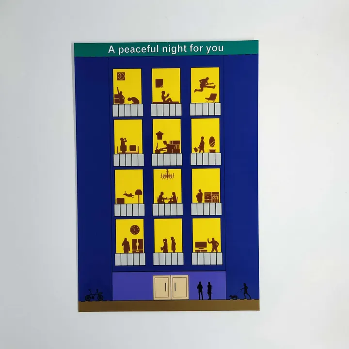 組み立てるとマンションになるユニークなポストカード「夜の住人たち」深海ブルー。 シルエットで描かれた住人たちが、窓越しに夜のドラマを繰り広げています。 深海ブルーの色合いが、夜の住人たちの謎めいた雰囲気を引き立てます。 手紙やプレゼントに添えて、特別なメッセージを届けるのに最適です。 当店は夜の街をテーマにした様々なハンドメイド雑貨を販売しています。 夜の街は、色とりどりのネオンや星空、月明かりなど、美しい光に満ちています。 私たちはその風景を雑貨に取り入れて、お客様のお部屋に夜の街の雰囲気を届けたいと思っています。また、夜の街は、静かで落ち着いた時間や、楽しくワクワクする時間など、様々な表情を見せてくれます。 当ショップではその表情を雑貨に反映させて、お客様の気分に合わせて使えるように工夫しています。 当ショップは全ての商品のデザインに「穏やかな夜を過ごせますように」という思いを込めています。ぜひ、私たちの雑貨をご覧ください。夜の街の魅力を感じていただけると嬉しいです。 〈商品内容〉 ポストカード 1枚