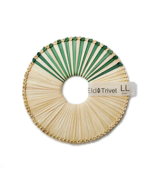 江戸時代の旅支度に欠かせなかった編み笠の材料”菅(スゲ)”が使われており、かつて釜敷きにも使われた菅は熱に強く、防水透湿性も非常に高い素材です。 水が降りかかると撥水性のある繊維がはじき、湿気が多ければ編んだ菅が膨らんで内部に通さず、乾燥すれば菅が戻り、自然に風通しが良くなる優れもの。 ご家庭に合わせて使いやすいサイズとお好みのカラーをお選びいただけます。 EldスキレットLLや土鍋に最適なLLサイズ。 ベージュ色のプレーンを基調とし、アクセントとしてポトペリーオリジナルカラーのグレーとグリンを配色しました。 深江菅細工 大阪は深江の伝統工芸品で、江戸時代の旅支度に欠かせなかった編み笠の材料”菅(スゲ)”。 手作業で丁寧に編み込まれた編み目、昔ながらの技法で染められた差し色は、ひとつひとつ風合いが異なり、使い込むほどに愛着がわく逸品です。かつて釜敷きにも使われた菅は熱に強く、防水透湿性も非常に高い素材です。 菅本来の色が楽しめるプレーン2種類の他、ポトペリーオリジナルカラーのグレーとグリーンがございます。