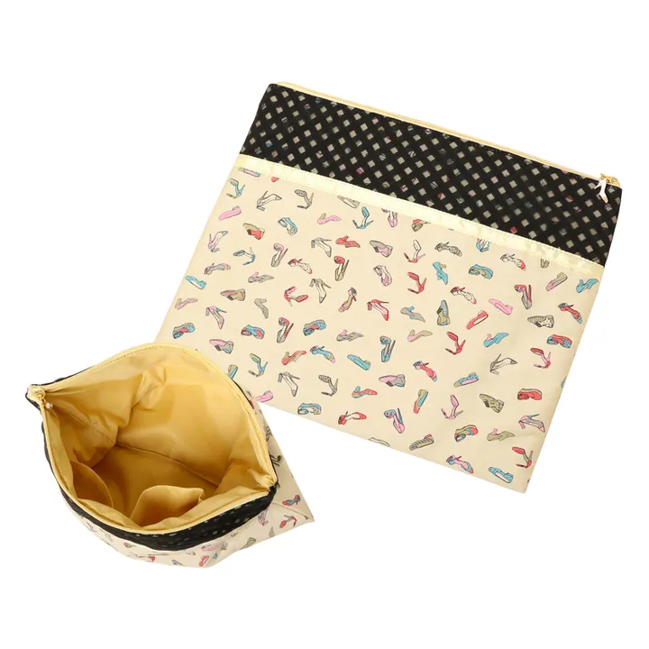 タブレットやラップトップケースとして最適なBigサイズのポーチ。 クッション性のある肉厚な素材感です。 クラッチバッグとしてもピッタリなので旅先のディナーやちょっとしたおでかけにもぜひ連れて行って! 内側2か所オープンポケット付き。 靴が散りばめられた総柄デザインは、それぞれ柄やシェイプが違うからお気に入りを探すのも楽しい。 引手のハイヒールチャームがワンポイント。 ※正規の電子機器ケースではございませんので自己判断の上ご使用ください。