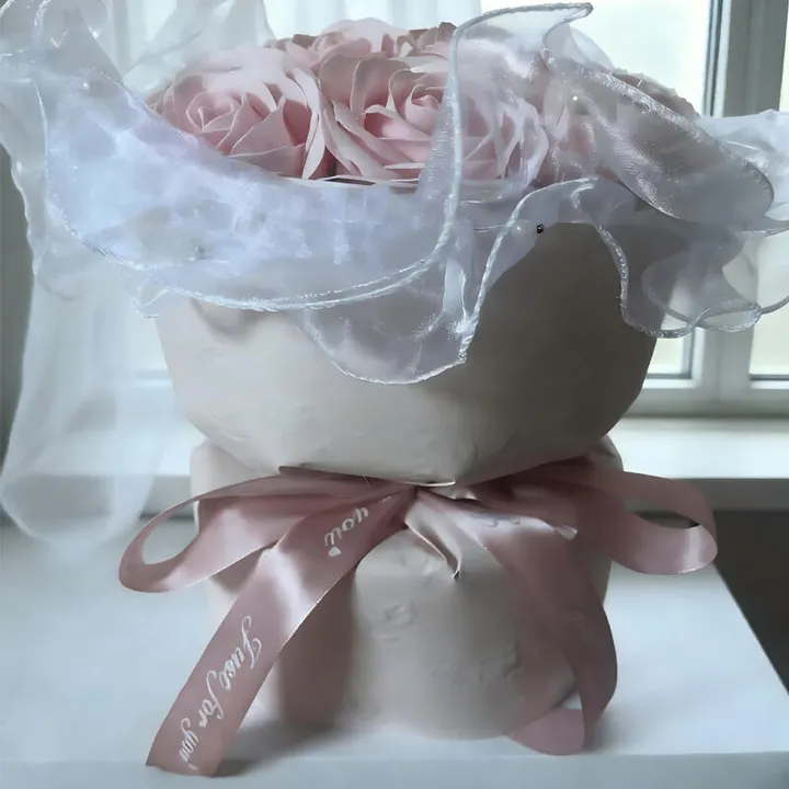 ※プレゼントに最適なソープフラワーの花束です。ほのかに石鹸の香りがする、石鹸素材から作られた造花なので、生花に比べて、長く鑑賞が楽しめます。