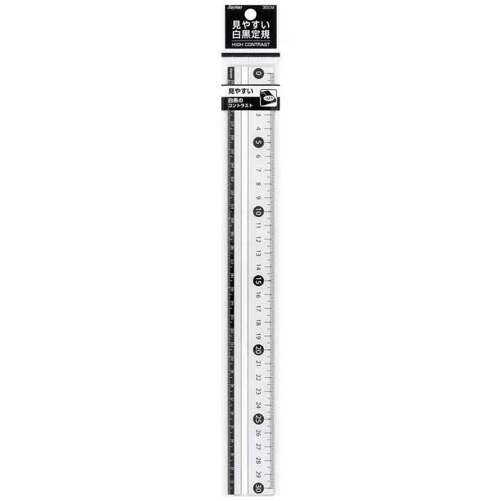 【白と黒のハイコントラストで視認性の高い定規】 ・白と黒のコントラストが強い為、文字とメモリの視認性が高い。 ・5cm毎の大きな数字で視認性が高くみやすい。 ・矢印付きメモリで線を引くときに読み取りやすい。 ・はしゼロメモリで高さ深さを測ることができます。