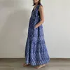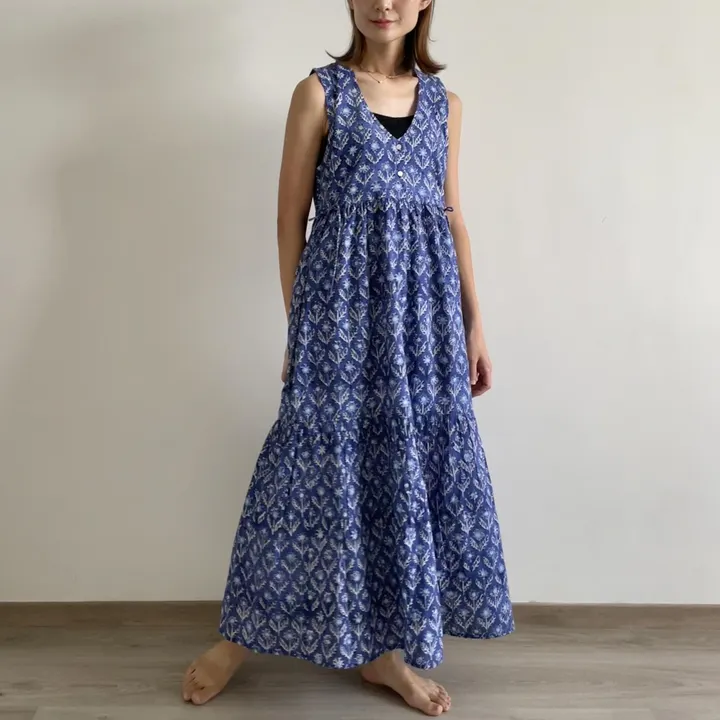 • • • • • • • • • • • • • • • • • • • • • / 重ね着できる万能ワンピース \ 深めのネックと広めのアームホールでTシャツやブラウスなどを重ね着してジャンパースカート風にも楽しめるデザインにしました。 暑い時期はキャミインナーを中に着てラフ感あるコーデになります!インド綿100%の裏地付きなのでペチコート等は不要です◎ 4本のウエスト紐をサイド or 前後で結んで体型に合わせてウエストマークもできます。 ポケット・裏地付きで着心地・利便性も◎ * 胸元のボタンホールはインドの縫い子さんによる手縫いで仕上げられたものものもございます。 • • • • • • • • • • • • • • • • • • • • • ▶︎ One size ▶︎ Size 平置きサイズ、着用モデル身長167cm (普段M-Lサイズを着用) - 総丈 130cm / バスト幅50cm / ウエスト幅52cm / 肩幅34cm / アームホール25.5cm * 上記のサイズ±0.5〜1.5cm 差がある場合もございます。 * 総丈以外のサイズは120cm丈、130cm丈どちらも同じです。 ▶︎ 素材 - 生地 : インド綿 100%、ブロックプリント - ボタン : 貝ボタン ▶︎ 生産 - インド パートナー工場 ▶︎仕様 - ポケット / 裏地付き (インド綿100%) • • • • • • • • • • • • • • • • • • • • • ▶︎お手入れ方法 *着用前に一度水通し(冷水で)をしてください。 |洗い方 ブロックプリント生地は色落ちの可能性がありますので、水(お湯ではなく冷水)での単品洗い・手洗いをおすすめします(お湯で洗うと縮んでしまう可能性があります)。強く擦って洗うとプリントが落ちる恐れがありますので、優しく手洗い・押し洗いしてください。 |干し方 縮んでしまうので乾燥機は使用しないでください。 色褪せ防止のため、陽の当たらないところで干してください。 • • • • • • • • • • • • • • • • • • • • • ブロックプリント生地の風合いについて 一回一回、職人さんが木版を押して出来上がる生地のためマシーンプリントやスクリーンプリントとは異なりプリントのかすれ・ズレ・色ムラ・インクの跳ねなどがございます。ブロックプリントならではの手作りの温もりをお楽しみください。 ブロックプリントの風合い・柄の出方は1点ごとに異なり、柄が左右完全対照でないこともございます。ブロックプリントの風合いをご理解いただいた上でのご購入をお願いいたします。 • • • • • • • • • • • • • • • • • • • • • 各色柄・サイズ3-5着の販売。インド現地で入手できる生地はその時で変動があるため、増産予定はありません。 インドの職人さんが一つ一つ丁寧に縫製してくれていますが、数mm縫製のズレがある場合がございます。 生地に着用・洗濯に問題ない小さな織り傷がある場合もございます。 • • • • • • • • • • • • • • • • • • • • •
