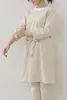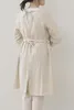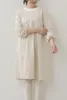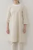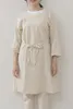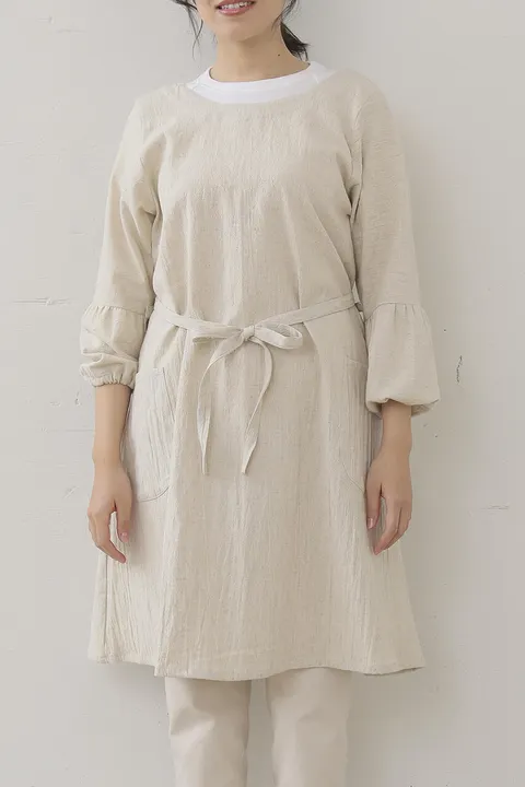 ワンピースのように着られるカッポウギ。 洗いをかけた綿麻生地で着心地も柔らか。 腰紐(脱着可能)の使い方で2つのスタイルとお楽しみいただけます。 袖をまくっても腕のシルエットが美しくおさまるように仕立てました。