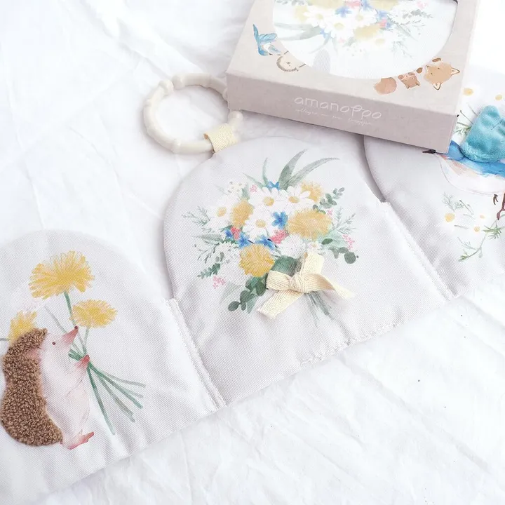 ・大切な人への想いを 花々にのせてamanoppoが伝えます お祝いの気持ちが込もった花束のように、大人も貰って嬉しいデザインに仕上げました。 えほんの中心に描かれた花束は、cocory friendsのどうぶつたちがそれぞれ運んできたもの。 「幸福」「癒やし」など赤ちゃんとママへのエールになるような花言葉を持つお花を選びました。 ・赤ちゃんにも嬉しい仕掛けもたくさん どうぶつたちの体の一部がもふもふの生地になっていたり、 めくったり、パリパリの音で楽しく遊ぶことができる赤ちゃんにも嬉しい仕掛けえほんです。 大きくなったらリボンを結ぶ練習にも使えたりと、永く遊べます。 ・“お部屋に飾る” も意識して お部屋に生ける花を見つめる時のように、 育児の合間にママもほっと心がゆるむような心地よい時間を送って欲しい… そんな思いで、このぬのえほんは生まれました。 ぬのえほんはお気に入りのページの向きに飾ったり、 立てておくことができます。