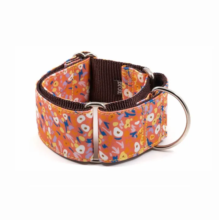 MIRAVETは柔らかくも明るい色調が特徴的です。 オレンジカラーの背景に様々な花が描かれています。オリジナリティを発揮してお散歩に差をつけましょう! この犬の首輪は、環境保護に貢献するためにリサイクル素材を使用しています。バルセロナの自社工房でデザインされ、地元のサプライヤーとともにハンドメイドされており、カーボンフットプリントの削減を実現しています。 ? マーチンゲールカラー 幅が4cm、5cmと通常よりも広め。 頭と首が細長く通常の首輪では抜けてしまうハウンド犬種に、特にぴったりのハーフチョークタイプです。? ハウンド系犬種以外でも幅広くお使い頂けます。頭からかぶせて着用するので、頭のサイズも必ずご確認ください。 ? ? 素材 裏地:ポリエステル100%リボン(エコテックス認証取得)表地:リサイクルポリエステル94%、スパンデックス6% バックル:特許取得のアルミニウム製サイドリリースDリング Made in Spain