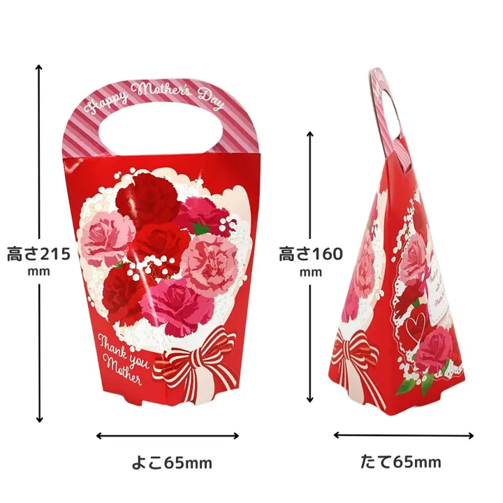 カーネーションの花束が華やかな 母の日専用のスタンド型ギフトボックスです。 お母さん・ママへの感謝のギフトにピッタリ。 自立して21cmの高さがあるので、店頭ディスプレイで目立つ商品。 両面でデザインが違うので、両面並べてディスプレイすれば、 同じ商品が並んでいてもボリュームアップ。 手さげ付でお客様が売り場で手に取りやすいギフトボックスです。 上部の差込を先に封をして、底部からお菓子や中身を入れて閉じると組みやすいですよ。 シールや包装紙、リボンのいらない便利なデザインボックスは人気商品です。 OPP袋なども特に必要ありません。 マドレーヌ(50×70ミリ見当)だと3個入るサイズです。 マドレーヌ・フィナンシェ・クッキーなど半生菓子や焼菓子、 おかき・あられ・キャンディー・ドライフルーツのギフトに。 靴下やハンカチ、ミニタオルなどアパレルや バスボム・バスソルトなど雑貨のギフトにも。 ティーバッグ・ドリップコーヒーなど個包装した商品にも。 イベント専用の箱は置くだけでコーナー作りに便利です。 手さげ付でお客様が売り場で 思わず手に取ってしまうようなカラフルでかわいいギフトボックス。 プレゼントやお祝いにピッタリです。 無駄の少ない少ロット50入。 ※画像では少し濃く写っていますが、実物のカラーは少し薄くくすみカラーのような色合いです。 ※ご利用の端末ごとに見える色合いのイメージが異なります。 ご確認が必要な際にはサンプルのご発注を推奨しております。