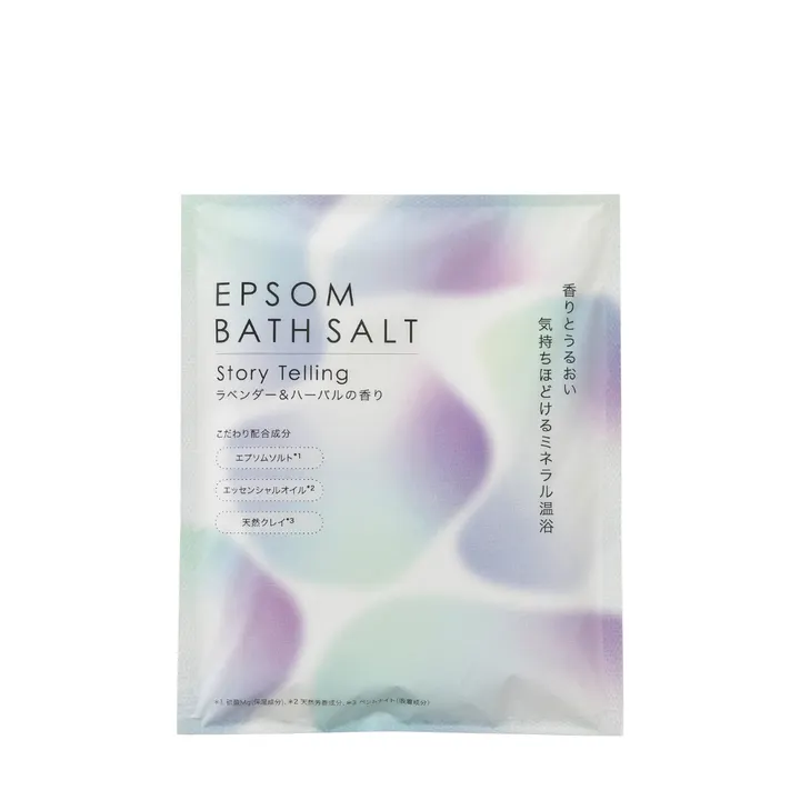 【ラベンダー&ハーバルの香り】 今日はどんなバスタイムにしよう? お出かけする時の洋服を選ぶように、夕食の材料を選ぶように、今日のバスタイムを選びたい。そんな想いから生まれた入浴料です。 エプソムソルト(硫酸Mg(保湿成分))をメインに、エッセンシャルオイル(天然芳香成分)、天然クレイ(ベントナイト(吸着成分))を合わせました。 入浴により体を温め、肌を柔らげしっとりなめらかな肌へと整えます。 ~香りとうるおい 気持ちを満たすミネラル温浴~ 天然由来の香り:南仏ラベンダーにコモンセージ、甘い半日花(シスタス)と爽やかな芳樟(ホーリーフ)でゆったり時間のスイッチON。 湯色:透明タイプ 【エプソムソルト入浴効果】 マグネシウムの作用で皮膚のバリア機能が高まり健やかな肌に導くと言われる 湯冷めしにくく保温効果が持続 発汗を促し汗と一緒に老廃物を排出、デトックスに 塩ではなく塩分を含まないため風呂釜を傷めにくい(必ずご家庭の風呂釜の種類をご確認ください)。 塩配合入浴剤で肌刺激を感じる方にもおすすめ(すべての方に刺激が起こらないというわけではありません)。