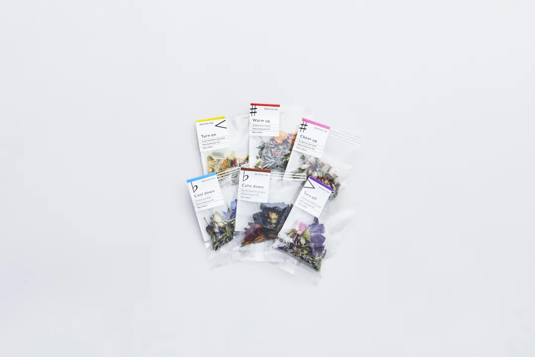 daytune. teaのブレンド全6種類を1個ずつお試しいただけるセットです。 daytune.のリーフレットも1部お付けいたします。 それぞれ日常の様々なシーンを想定して、オリジナルで丁寧にブレンドされています。 朝の仕事前や落ち込んだ時、集中したい時など、慌ただしく過ぎる時間の中でふと気持ちを切り替えたくなったら。 異なる色、味、香りのハーブティーから自分の状態に合わせて一つを選び味わう、チューニンングの時間をお過ごしください。 < Turn on 風味の特徴:柑橘を感じる爽やかさ 使用ハーブ:ローズヒップ、ジンジャー、フェンネルシード、オレンジピール、レモングラス、カレンデュラ おすすめのシーン:朝起きた時/仕事や家事を始める前に、勉強・趣味などの活動前に ♯ Warm up 風味の特徴:さっぱりとした酸味と爽やかな清涼感 使用ハーブ:サンザシ、ハイビスカス、ジンジャー、ペパーミント、ローズマリー、ゴツコラ おすすめのシーン:プレゼンや会議など、大事なイベントの前に ♯ Cheer up 風味の特徴:フルーティーな香りと甘酸っぱさ 使用ハーブ:ローズヒップ、月桃、ハイビスカス、グリーンオート、エルダーフラワー、千日紅 おすすめのシーン:仕事や家事、やることを切り替える時に、アイデアを考える時に ♭ Cool down 風味の特徴:清涼感のある爽快さと優しく上品な後味 使用ハーブ:ペパーミント、レモングラス、バタフライピー、ホーリーバジル、ローズマリー、コーンフラワー おすすめのシーン:白熱した議論の後に、やることを整理する前に ♭ Calm down 風味の特徴:コーヒーのような香ばしさ、苦味、コク使用ハーブ:チコリ、ブラックマロウ、フェンネルシード、シナモン、バラ おすすめのシーン:じっくり腰を据えて作業や勉強をする時に > Turn off 風味:上品な華やかさと爽やかな香り 使用ハーブ:コモンマロウ、ダマスクローズ、バラ、レモンバーム、スペアミント、ラベンダー おすすめのシーン:眠る前/ドラマや読書を楽しむリラックスタイムに