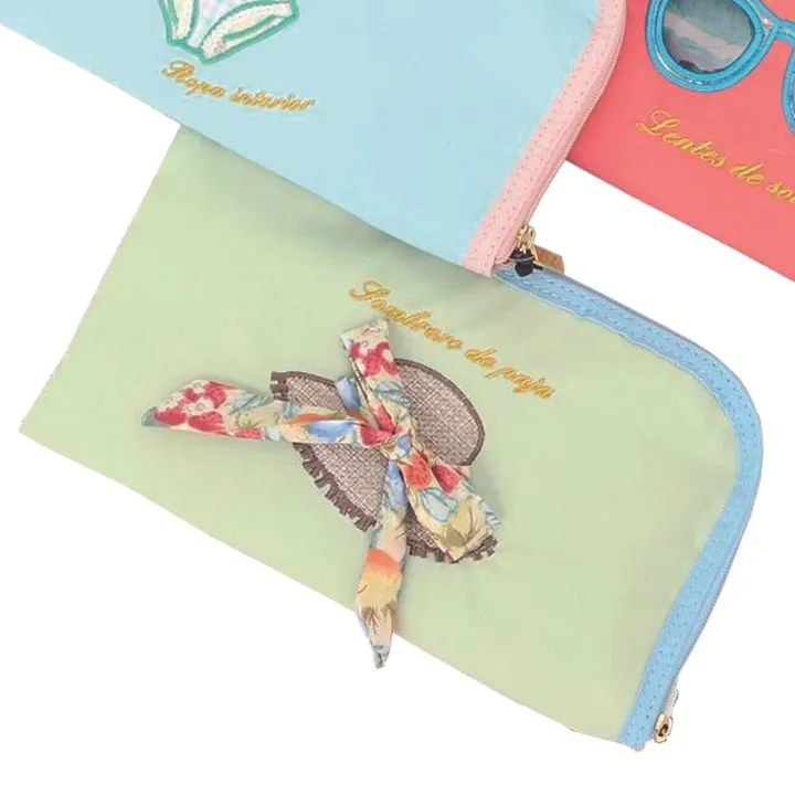 内側にカードポケットとオープンポケット、さらには取り外し可能なファスナーポーチが付いたパスポートケース。 エアチケットがすっぽり入るサイズ感でマルチケースとしても◎ 便利なメッシュポーチ付き。 ディテールにこだわったアップリケが印象的な "リゾートアップリケシリーズ" 。 リボンを結べるストローハット、海がうつりこんだサングラス、ドットとフリルのアンダーウェア、とカラーによってアップリケが異なります。