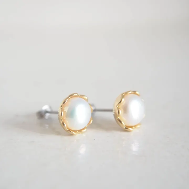 ピアス【Vintage】/スカラップフレーム淡水パール8mmピアス 波状の「スカラップ」フォルムと共に メタル素材と天然素材のコンビネーションをナチュラルに楽しむアイテム 連続した半円の波状の縁取りデザイン ホタテ貝の意を持つ「スカラップ」と呼ばれるフォルムを活かし 明るいトーンを纏う天然素材と金属素材とのコンビネーションと ナチュラルなテイストを大切に表現したイヤリング&ピアス 個々の色味の違いや表面の凹凸感など、天然素材ならではの表情を楽しめる淡水パールと ふんわりと浮かび上がるような光を纏う天然石のムーンストーンをチョイス それぞれのナチュラルな魅力にメタルの輝きと揺れ感を添えながら 自然体なムードをやさしく散りばめた作品です ////////////////////////////// 天然素材の表情を上品に引き立て ほんのりと甘さを添えるスカラップデザイン ////////////////////////////// 半円が連なり生み出されるウェーブ模様の『スカラップ』 その様子がまるでホタテ貝を並べたように見えることから「scallop」(英=ホタテ貝)と呼ばれています。 多くは衣服の裾や襟ぐり、袖口や、小物の様々な縁取りのアクセントとして施されることの多いスカラップ模様を オリジナルの枠として一からデザイン。 アクセサリーの小さなデザインの中にもリズミカルな模様が丁寧に表現され 淡水パールやムーンストーンの天然素材に上品に調和し愛らしく引き立てる Oucaらしいオリジナリティが光るひとしなに仕上がりました。 ◆詳細◆ Oucaの人気アイテム、Brideシリーズの一粒イヤリング『BD021【Bride】/淡水パール8mmイヤリング』と同じモチ型フォルムの8mmサイズ淡水パールがぴったりおさまる スカラップ模様で縁取ったメタル枠をオリジナルの原型として作成。 淡水パールにそっと沿うような端正なフォルムと素材を邪魔しない薄さにこだわりながら、 パールの魅力を損なうことなく引き立てるメタル枠をイメージし、パールとメタリックの見え方がちょうど半々くらいとなるよう仕立てました。 主張し過ぎず、淡水パールにしっくりと馴染みその魅力を際立たせる好バランスのスカラップ模様は、オリジナルならではの絶妙な仕上がりです。 正面から見た時の淡水パールをさりげなく縁取りアクセントになる枠の見え方だけでなく、 横から見た時のお花や実を思わせるようなスカラップ模様の曲線とパールのコンビネーション、 また柔らかな輝きとナチュラルさを引き立てるようにメタル部分の表面に施した筋目のテクスチャーなど、 コロンとした魅力的なモチーフの立体感を様々な角度から楽しめます◎ シンプルでベーシックな一粒パールのデザインが、ほんのり甘さも漂うスカラップフォルムのメタル枠をまとうことで 淡水パールの持つ凛とした表情がマイルドな雰囲気に調和されて、フォーマルなシーンはもちろん、デイリー使いにもぴったり! パール好きな方の心をくすぐるのはもちろん、活躍度の高いパールアイテムをお探しの方にもとてもお勧めです◎ こちらはモチーフのデザインをシンプルに楽しめるピアス。 ベーシックなフォルムは耳元にしっかりと収まる好バランス。 凛としたつややかさを放ち上品な雰囲気やきちんと感をしっかりと感じられる、どんなシーンにも頼れるひとしなです。 前作のモチーフが揺れるデザインとはまた異なる見え方で、お好みのタイプをお選びいただけます。 イヤリングタイプ(EN167)もございます。 商品には専用のBOXが無料で付属しますので、ギフトにも最適です◎