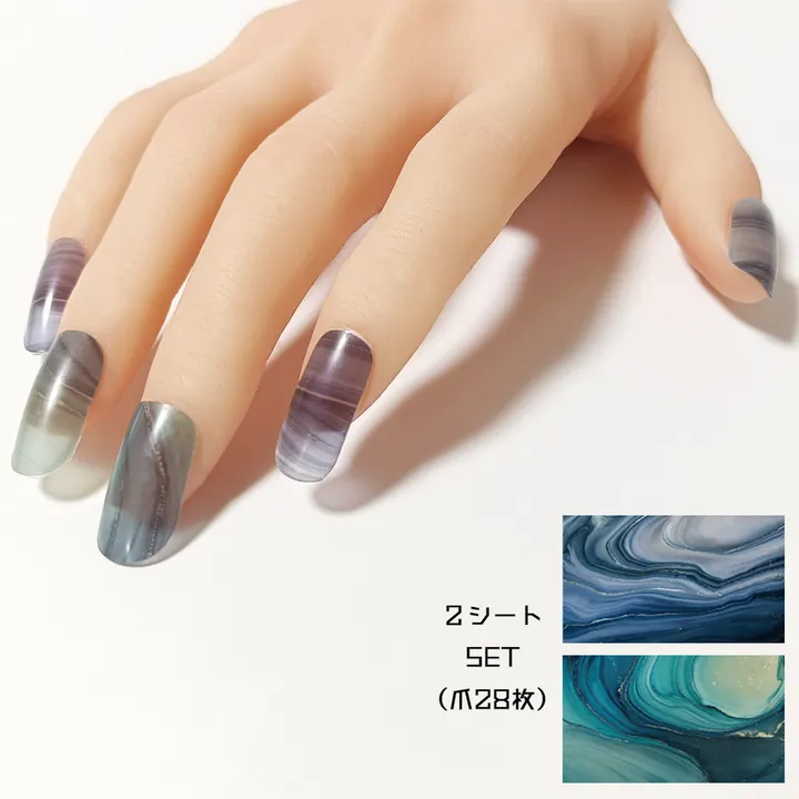 半硬化ジェルネイルシール「Gel nail stickers」007 Alcohol ink : Blue × Green Type:A(縦長プレーンな爪型)
