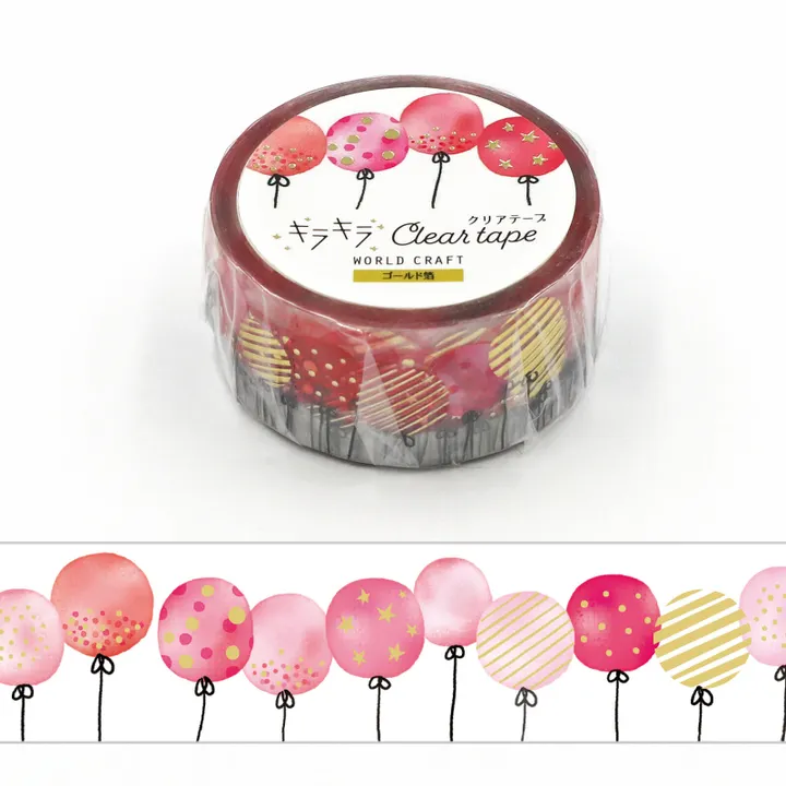 【 キラキラクリアテープ  Balloon】 ★★キラキラマステのクリアテープ版!  箔押しが魅力の「キラキラマステ」をクリアタイプのテープとして 新たにシリーズ化したキラキラクリアテープ!〜 第1弾 『ゴールド箔』による、12柄展開★★ プカプカと浮かぶ、赤やピンクの可愛い風船のデザイン! ノートやカレンダーの端に貼ったり、ファイルケースや瓶・クリアボトル など、いろんなものを可愛くデコレーションできちゃいます♪ PET素材ならではの【透明度×やわらかさ×粘着】が 紙素材へのデコレーションだけでなく身の回りの 小物デコレーションにも馴染みます♪
