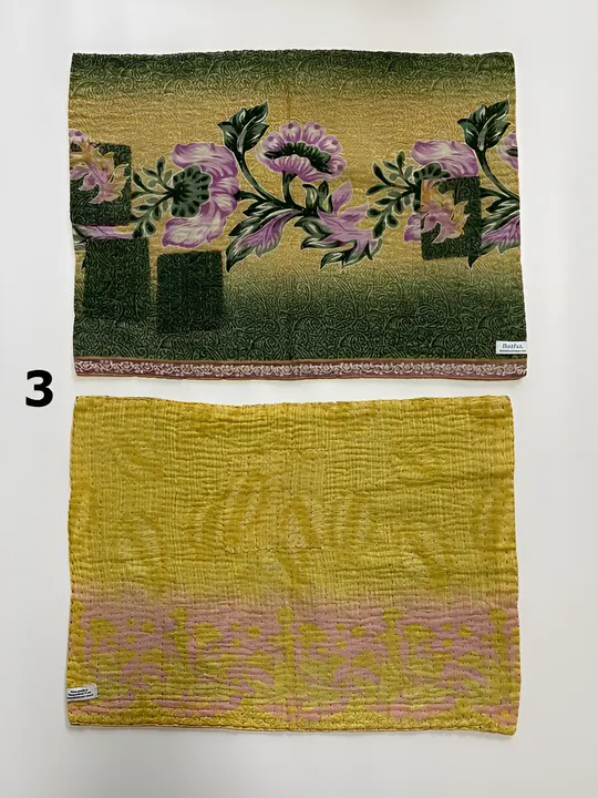 インド、スリランカ、バングラデシュなど南西アジアの国々の女性たちは日常的にサリーを着ています。コットンのサリーの古布を重ねて刺し子を施し再生したものを現地では”Kantha”と言います。 古いものを手を加えることで再生し、新たに命を吹き込んだKanthaは、同じものが世界に2つとない、エコでさらにユニークなお品です。 もともとは、母親が生まれてくる赤ちゃんのために、自らのサリーを重ねて、刺し子を施し、おくるみにしたところからこの技法が生まれたと言われています。丁寧に刺した生地は柔らかく、ちょっとポコポコした感じが肌にとても心地いいです。 プレイスマットは、幅約45センチ、高さ約33センチで、ランチマットにしたり、ヘッドレストのカバーにしたり・・・私は、プリンターの埃よけに使ったりしています。 また、2枚の異なった色柄のサリーを重ねているため、両面遣い(リバーシブル)もしていただけます。 *作り手の紹介 この商品をつくっているのは「Basha」。「Basha」は、バングラデシュで使われているベンガル語で「家」という意味です。様々な問題を抱えている女性たちが、手に職を着けて、仕事を得、自分の夢を持ち、それに向かって進んでいくために、彼女たちの「家」になりたいと、Bashaという名称にしたそうです。 仕事をし、適切な賃金を得ること、そして生きていくために必要な教育の機会もBashaでは設けています。Bashaの商品を購入していただくことにより、彼女たちの経済的・社会的な自立に貢献しています。 このお品は、TeebomのBusiness Partner “Basha“と協力して作っています。