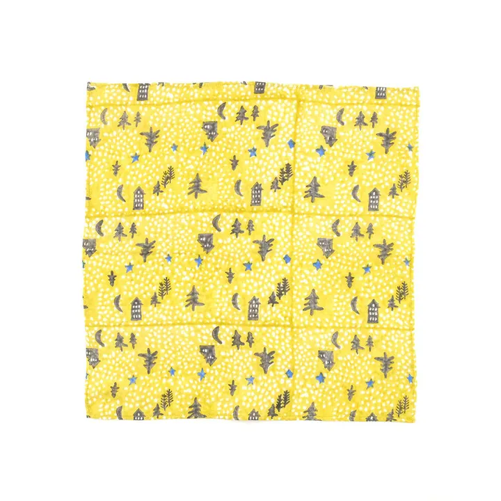 一年中でもっとも星空がきれいに見える冬の夜空をイメージしたハンカチ。ガーゼ素材なので、ハンカチとしてはもちろん、ふきんとしても使い心地抜群なアイテムです。一面に広がる星と森をプロックプリントで表現しました。 【ブロックプリントについて】 ブロックプリントとは、木彫り版でハンコを押すように1柄ずつ1色ずつプリントされたものです。 まず、アウトラインとなる柄のスタンプを押していき、そのあと色をのせていくため、使われている色の数だけ作業は複雑になっていきます。 染ムラやスタンプの境目が少しゆらいでいる場合もありますが、それも手作業ならではの良さであり、風合いとなっています。