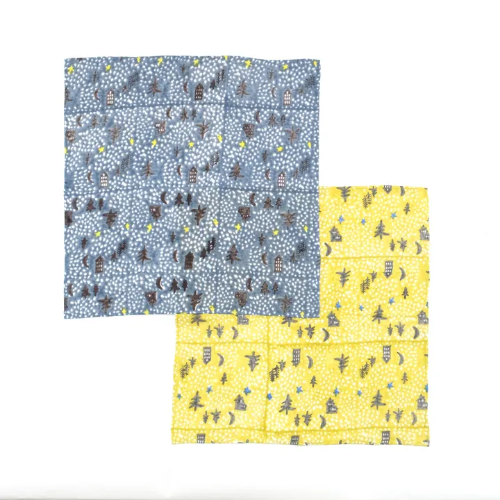一年中で最も星空がきれいに見える冬の夜空をイメージしたハンカチ。ガーゼ素材なので、ハンカチとしてはもちろん、ふきんとしても使い心地抜群なアイテムです。一面に広がる星と森をプロックプリントで表現しました。 ブロックプリントとは、木彫り版でハンコを押すように1柄ずつ1色ずつプリントされたものです。まず、アウトラインとなる柄のスタンプを押していき、その後色を乗せていきます。使われている色の数だけ作業は複雑になっていきます。全て手作業の為、染ムラやスタンプの境目などが少し出ていますが、それがブロックプリントの良さでもあり、風合いとなっております。