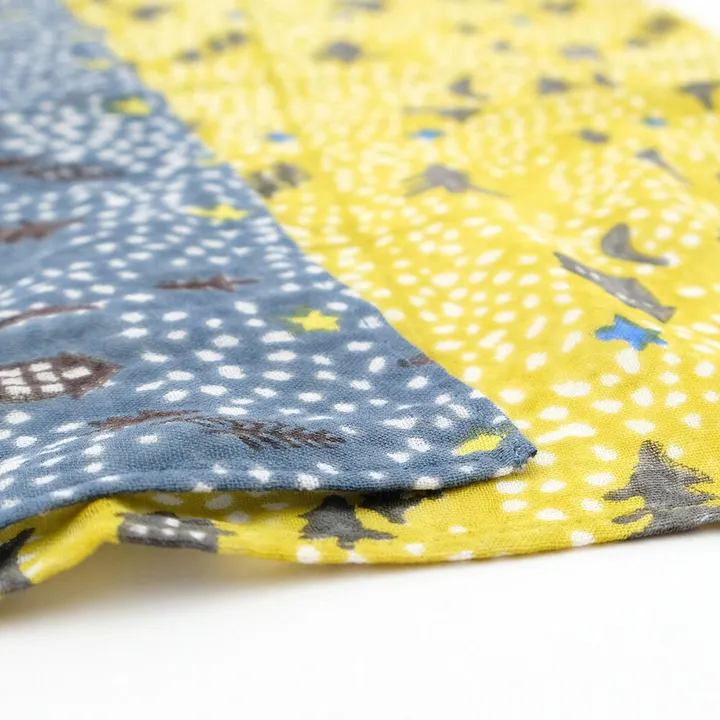 一年中で最も星空がきれいに見える冬の夜空をイメージしたハンカチ。ガーゼ素材なので、ハンカチとしてはもちろん、ふきんとしても使い心地抜群なアイテムです。一面に広がる星と森をプロックプリントで表現しました。 【ブロックプリントについて】 ブロックプリントとは、木彫り版でハンコを押すように1柄ずつ1色ずつプリントされたものです。 まず、アウトラインとなる柄のスタンプを押していき、そのあと色をのせていくため、使われている色の数だけ作業は複雑になっていきます。 染ムラやスタンプの境目が少しゆらいでいる場合もありますが、それも手作業ならではの良さであり、風合いとなっています。