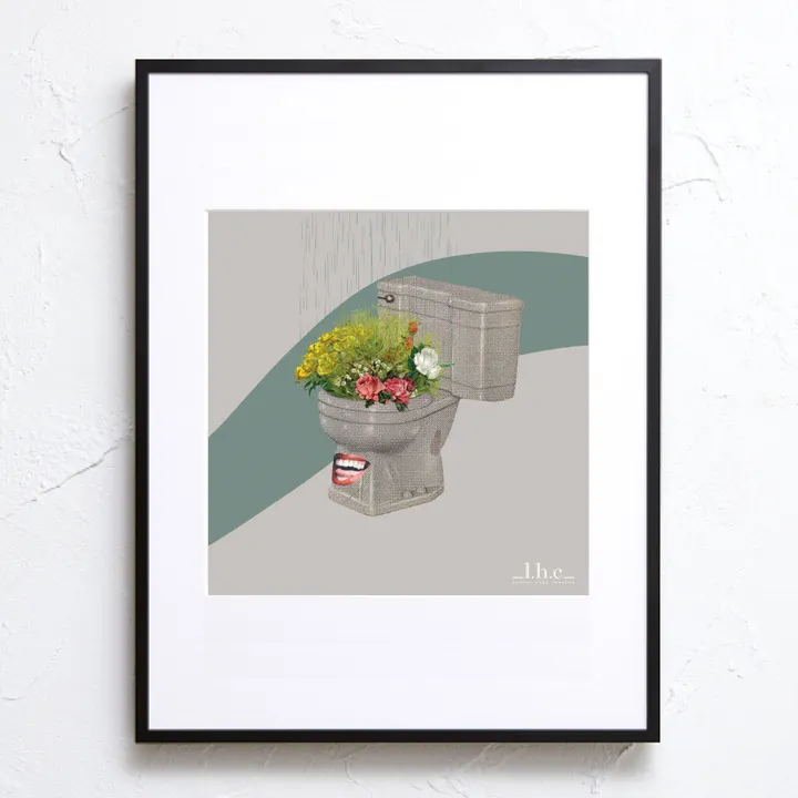 【現代アートポスター】トイレ 考える場所 花束 イラスト コラージュ A4(S) フレームセット:黒 29.4×38.4cm