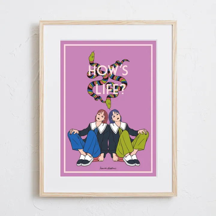 アーティスト -PROFILE- Satomi Kawai(サトミ カワイ) イラストレーター&グラフィックデザイナー 女子美術大学デザイン学科卒業 デザイン会社での勤務経て2015年フリーランスに。 ちょっとシュールで小洒落たイラストを描いています。 【作品について】 様々なことが起こる人生、楽しめてる? 作品名:HOW'S LIFE 手法:イラスト、デジタル ペーパー:高品質半光沢紙 マットカラー:白 マット*:DXホワイト芯 100%バージンパルプ/PH7・中性紙(2mm厚) ※全てのアートにマットがつきます フレームカラー:黒、白、無垢(3種類から選択) ※マット付のため通常とはフレームサイズが異なる規格となります。 【マット*とは?】 アートポスターの周りに挟んだ厚紙の事。 マットを使わない時に比べ余白により広がりが生まれ、作品の新たな一面を引き出せ作品の見栄えがグッと良くなります。また、額縁のガラス面と作品が直接触れたままにしておくと、くっついて作品を傷つけることがあります。マットを使用することでガラスと作品の間に空間ができ、作品を保護することができます。ブランドコンセプトにより全てのアートにマットがつきます。 ー ファッションのようにアートを ー 私達が掲げるコンセプトです! 毎日着替えるファッションの様に、アートも気軽に飾り変えて欲しい... 一旦飾り終えたアートにも光を当ててほしい... ポスター単体、またはリピートで中身だけのポスターを購入された方に"専用のハンガー"をセットでお届け。 「今までに無い!新しいアートの飾り方を提案」 飾る事がなくなった前のアートをハンガーにかけて洋服と一緒にかけてもらう。 その日の気分や、モチベーションですぐに取り換えられる様に。 もちろん、魅せる収納としても今までにないおすすめの飾り方です。