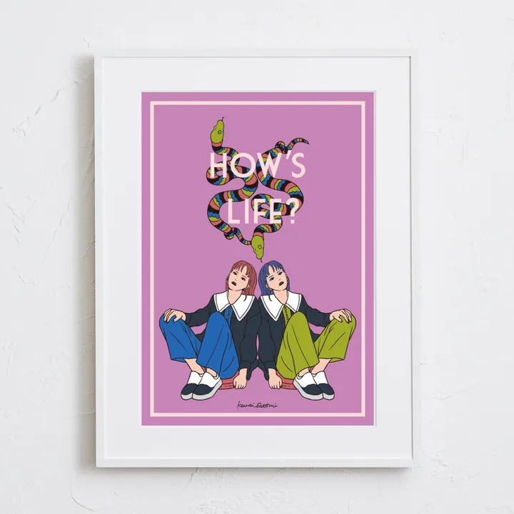 アーティスト -PROFILE- Satomi Kawai(サトミ カワイ) イラストレーター&グラフィックデザイナー 女子美術大学デザイン学科卒業 デザイン会社での勤務経て2015年フリーランスに。 ちょっとシュールで小洒落たイラストを描いています。 【作品について】 様々なことが起こる人生、楽しめてる? 作品名:HOW'S LIFE 手法:イラスト、デジタル ペーパー:高品質半光沢紙 マットカラー:白 マット*:DXホワイト芯 100%バージンパルプ/PH7・中性紙(2mm厚) ※全てのアートにマットがつきます フレームカラー:黒、白、無垢(3種類から選択) ※マット付のため通常とはフレームサイズが異なる規格となります。 【マット*とは?】 アートポスターの周りに挟んだ厚紙の事。 マットを使わない時に比べ余白により広がりが生まれ、作品の新たな一面を引き出せ作品の見栄えがグッと良くなります。また、額縁のガラス面と作品が直接触れたままにしておくと、くっついて作品を傷つけることがあります。マットを使用することでガラスと作品の間に空間ができ、作品を保護することができます。ブランドコンセプトにより全てのアートにマットがつきます。 ー ファッションのようにアートを ー 私達が掲げるコンセプトです! 毎日着替えるファッションの様に、アートも気軽に飾り変えて欲しい... 一旦飾り終えたアートにも光を当ててほしい... ポスター単体、またはリピートで中身だけのポスターを購入された方に"専用のハンガー"をセットでお届け。 「今までに無い!新しいアートの飾り方を提案」 飾る事がなくなった前のアートをハンガーにかけて洋服と一緒にかけてもらう。 その日の気分や、モチベーションですぐに取り換えられる様に。 もちろん、魅せる収納としても今までにないおすすめの飾り方です。