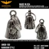 アメリカ製ガーディアンベル社製ガーディアンベルです。 MADE IN USA アメリカ製 交通安全 魔除け 御守り ガーディアンベル アメリカのライダーの間には、事故や、転倒の原因は「道路にひそむ悪魔」によるいたずらだという伝説があります。悪魔は走る者に悪戯やトラブルを運んできます。このベルは美しい音色で悪魔たちを追い払うと言われ愛されています。そんな悪魔のいたずらを防ぎ、御守りとなるのが、守護者のベルという意味を持つガーディアンベル。 日本でも鈴の音(ね)は神道では魔除けの音と言われています。ピューター製の鈴でいい音色でガーディアンベルはデザインも様々あります。 またガーディアンベルにまつわる伝説として、プレゼントとして送られたベルの効果は、自分で手に入れたものの2倍になると言われています。 それゆえに彼氏・彼女・友達・家族へのプレゼントとしての人気も非常に高まっています。 シルバーアクセサリーのようにおしゃれに装着できて素敵な音色を奏でるガーディアンベル。 バイカー以外にも自転車や旅・交通安全のお守りとしてお使いいただけます。 カバン・ランドセル・キーホルダー・ペットの首輪等に付けてお使いください!! ※タイラップ等でバイクのフレームにも簡単に取り付けできます。 アメリカンモデルだけではなく、旧車ファン、レプリカライダーまで、さらにバイクだけでなく、自転車や車にもピッタリな御守りとなっています。 アクセサリーとしても人気で、アイディア次第で車体だけでなく、キーホルダーや鞄など、どこにでも付けておしゃれに楽しめます。
