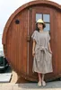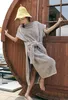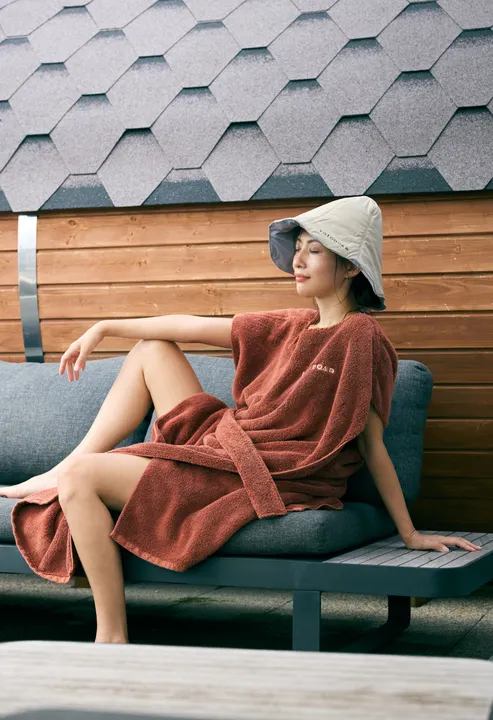極上質感のタオルポンチョです。大胆にバスタオルを2枚使い、出来るだけシンプルに出来るだけ扱いやすく工夫を盛り込んだデザインになっています。 着用方法はシンプルで、頭からかぶり両脇のリボンを前で結ぶようにします。 寒い時の外気浴では腕を中に入れるようにしてお使いいただくのがおすすめです。 サウナシーンだけでなく、海やお風呂上りのガウン代わりにも◎ ずっと包まれていたいタオルポンチョです。 タオル生地には溶ける糸を使いその糸が溶けることでスキマが生まれるような特殊な加工を施しています。 そのスキマがあることで空気を含みふんわり質感になり、そして吸水性が良くなり水分をぐんぐん吸い込みます。 また速乾性もありとても扱いやすい素材感です。 〈サイズ〉 着丈:約113㎝ 身巾:約70㎝ 〈素材〉 コットン100%