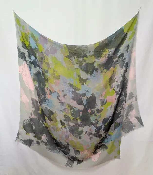 肌ざわりの良い薄手ウールにアバンギャルドにカモフラージュ柄を捺染しています。 幅広のため肩に羽織るように使うこともできます。 軽く、温かく、真冬から春先までご使用いただけます。