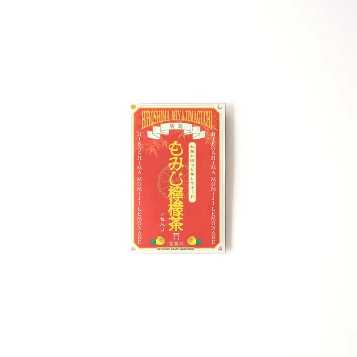 【もみじ檸檬茶】 〜モミジレモンチャ〜 世界遺産「厳島神社」の美しい朱色をイメージし、島の名所でもある紅葉を原材料に使用。ほうじ茶をブレンドすることにより落ち着いた印象のレモネードに仕上げました。もみじ饅頭のお供にぜひ。 広島銘菓もみじ饅頭などのお茶菓子にもぴったりな少し酸味のあるレモネードです。 もみじ饅頭と一緒に気の利いたお土産として。お客様のおもてなしやお茶菓子と一緒に。さまざまなシーンで広島を感じて頂けます。 ◆ひろしまグッドデザイン賞受賞商品 ----------------------------------------------------- 【お召し上がり方】 パウダー一袋にお水かお湯、120mlを注いでよく混ぜてください。夏はたっぷりの氷でキリリと、冬はあったかいお湯でゆっくり。中に少しレモンの果皮が入り込んでて楽しい飲み物です。 サラダにかけても、お酒に、スイーツに。楽しみ方は自由です。 広島名産のお土産品、お取り寄せ品として。 賞味期限は製造日より1年程度です。期限2ヶ月前のものまで発送対象になります。 商品背面の品質表示をよくお読みの上保管ください。 ●名称:紅葉レモネード粉末 ●原材料名:砂糖(国内製造)、レモン粉末、もみじエキス粉末(もみじエキス、デキストリン)焼レモン、ほうじ茶粉末/酸味料、香料、赤ビート色素 ●内容量12g×2袋 ●賞味期限 製造より1年間 ●保存方法:直射日光、高温を避け常温で保存